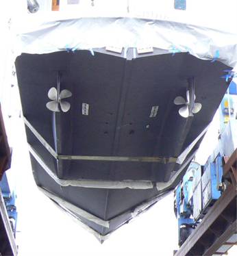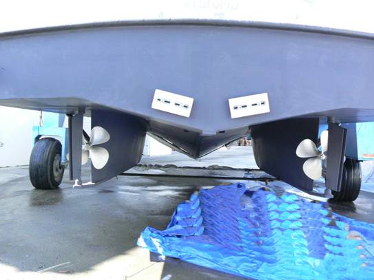 On first glance you may think DESERT VENTURE comes with wheels. No, those are the travel lift wheels. D/V has just been lifted and is about to get a fresh water wash down and ultimately launched. Notice the nice black fender around the top edge of the platform. Doesn’t she look all pretty in her new paint?
