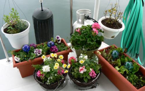 I pull all the pots inboard, against the housing on the deck, with some on the counter, as they do NOT like salt water spray. I use non-skid to keep them in place. I have never lost a pot. I try to give them a fresh water wash down, too. I can always tell if they get salt spray as the flowers get white spots.