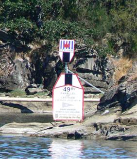 We left Telegraph Harbor for Ladysmith Harbor. Bruce wanted to check this place out – we had never been there. We cruised the entire harbor before settling on a small anchorage just north of Dunsmuir Island. The sign showing the 49th parallel was in the north end of the harbor. Ladysmith is a busy logging port. We watched a handful of little tugs moving logs around for two days. There was a lot of shore side industrial noise and road traffic coming across the water, from Ladysmith, on Vancouver Island. We heard a train, too, which was news to us. It runs from Nanaimo to Victoria. Very neat! We might have ridden it if we had known about it. We counted two passenger cars. One other thing was the odor – very strong odor of fresh cut logs. It made me think of fresh cut firewood in the fall, but it was almost oppressive.
