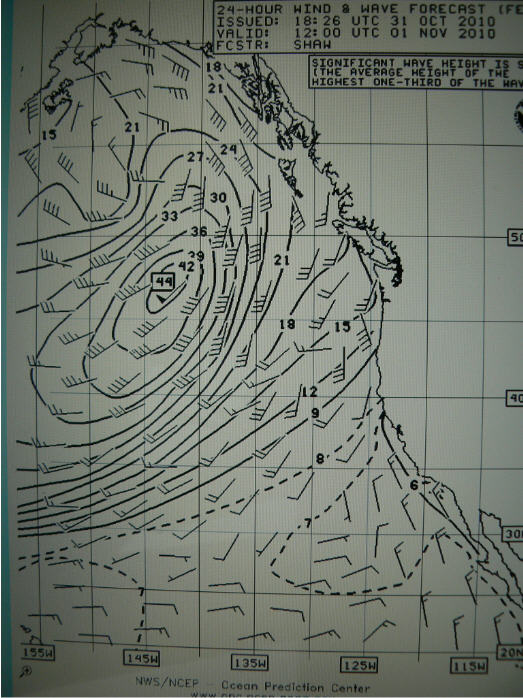 We started our departure from Half Moon Bay, thinking we would be tied up in Monterey in 6 hours. Checking the current ocean conditions we decided we could make it “around the corner” to Southern California if we upped the RPM’s and made a run for it. There is a huge swell that is now beating on the Northwest coast of America. We saw 44 foot waves in the center of the monstrous event!