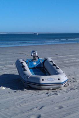 Here is our cruiser dinghy waiting for our return. We managed to land the dinghy, timed the waves, and had a safe dry ride back to DESERT VENTURE (in the background) – At Home – in Bahia San Juanito!