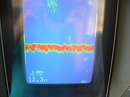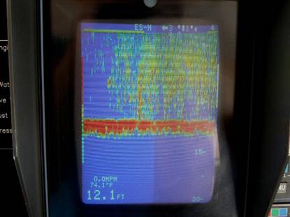 If you look back up at the top photo of the depth sounder, you just see water – and maybe a fish. Look at this! This is the second incoming wave. The initial in and out stirred up the water significantly.  See all the matter that it stirred up. Just to be clear, this is not my sea monster. 🙂  Wow.  [Note: The red portion is the marina bottom, and everything above the red area is the water underneath the boat, with the top of the monitor being the bottom of the boat.]