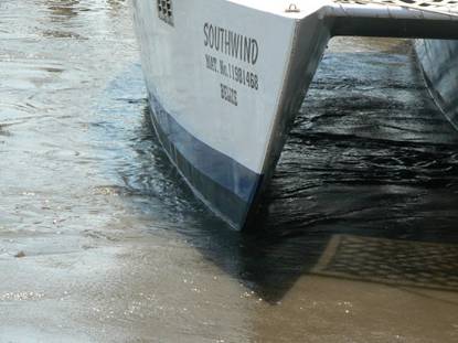 SOUTHWIND, is moored just behind us. It’s a catamaran that takes guests in the resort out to the islands for a day of fun and sun.  Notice the current swirling and racing by.