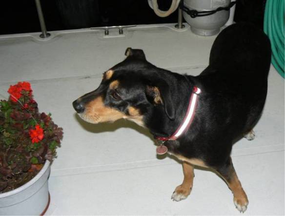 We had an unexpected visitor aboard the other night. Bruce says she smelled my pizza. She got puppy treats instead of pizza. She now visits regularly – go figure. She is a trooper on those stairs – I never expected a dog to show up on our aft deck in the boat yard. As usual, food on DV brings visitors aboard.