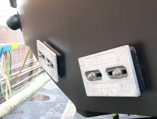 The anodes are our protection against corrosion. Aluminum boats have one major enemy – corrosion, and our Electro Guard System protects us successfully with the anodes. Proof comes each time we haul out and there is no corrosion to deal with. The anodes “die” to save the hull. We replace the anodes every ten to eleven months. This means our hull is solid and has full integrity. The bow thruster zinc gets replaced about every five to six months.