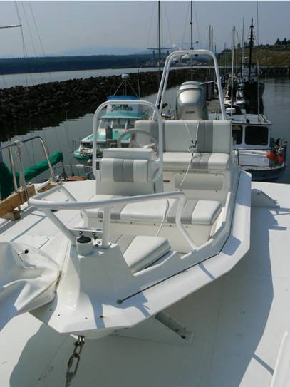 I admit I never really thought about the design of the big dinghy. Hard bottom, inflatable pontoons, water stays out, and we sit comfortable – and can go fast. What else is there to know? For one thing, the hard body isn’t all that much – body, that is. Take a look at the hard body part of the dinghy. It kind of looks like a bumper car at the amusement park.