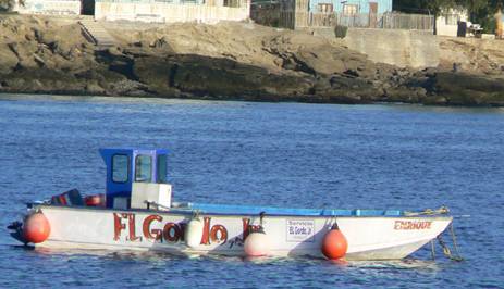 This panga belongs to El Gordo, Jr/Enrique. This is the panga that we refueled with this time. Enrique’s man, running a skiff, led us clear into the bay to his buoy, where he assisted us in getting set up, then brought the fuel panga alongside for the process. They tie to us, and we are secured to their mooring buoy.